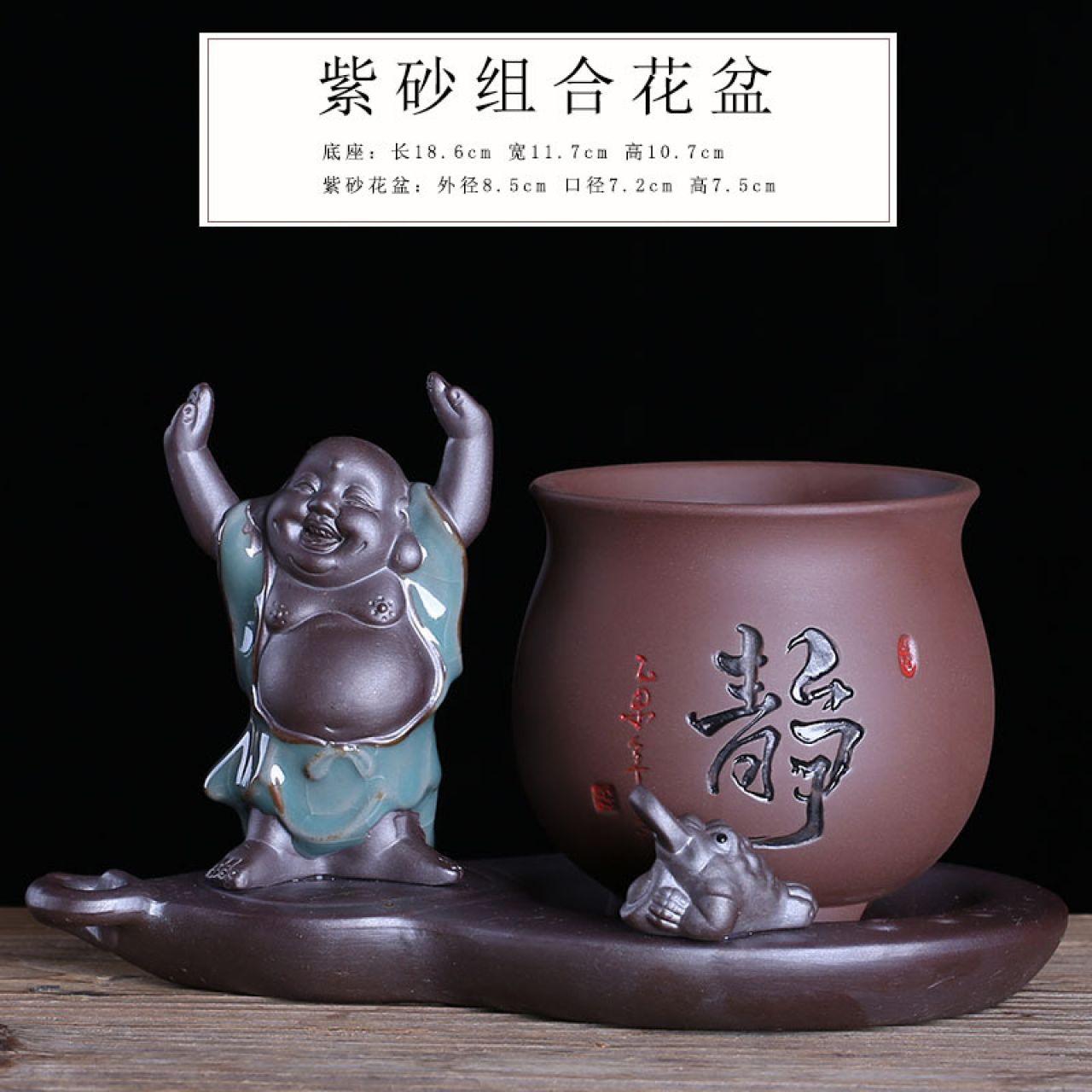 创意紫砂摆件和尚小花器家居装饰品茶桌绿萝花插花瓶陶瓷水培容器 Z233笑对人生+紫砂0371黑组合 小